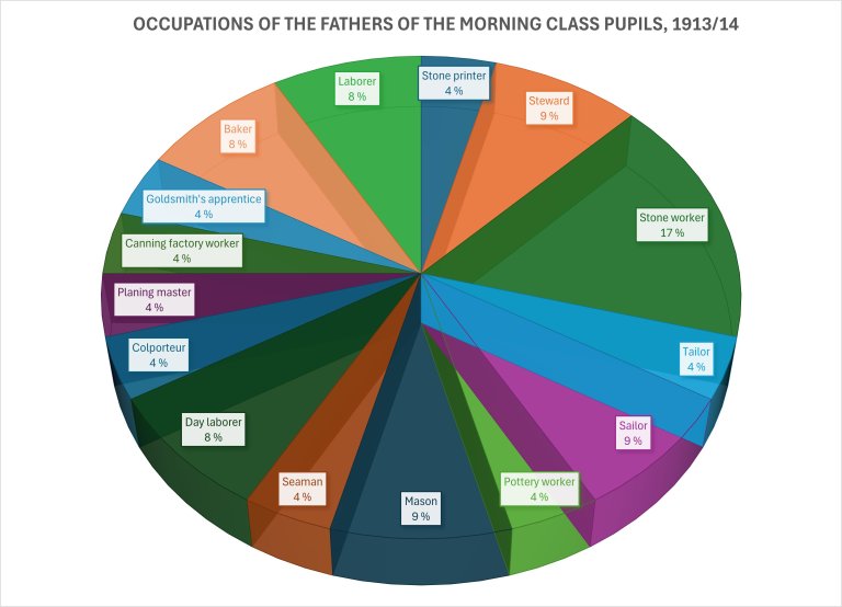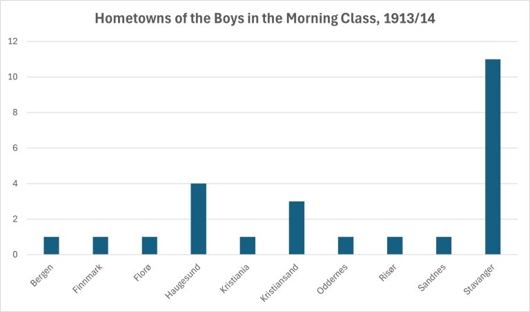 Karsten attended the morning class with between 14 and 18 other boys. The number varied throughout the school year, as new boys arrived and others were discharged. In total, 25 boys attended the morning class at some point during the 1913/14 school year. Eleven of them were born in Stavanger, four in Haugesund, and four in the Kristiansand area. Their fathers held typical working-class jobs – four were stone workers, and four were day laborers, general laborers, or sailors/seamen.