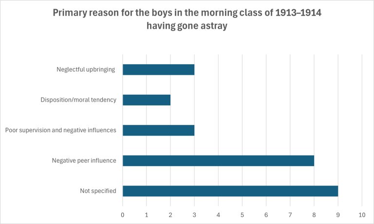 Theft was common, and several had also committed burglary in connection with these acts.Three of them had been truant. A small number – fewer than five – had been in contact with the police for other matters, such as substance use, vagrancy, receiving stolen property, embezzlement, and arson. According to the reported information, the underlying cause of their criminal behavior was that the boys had fallen into bad company.