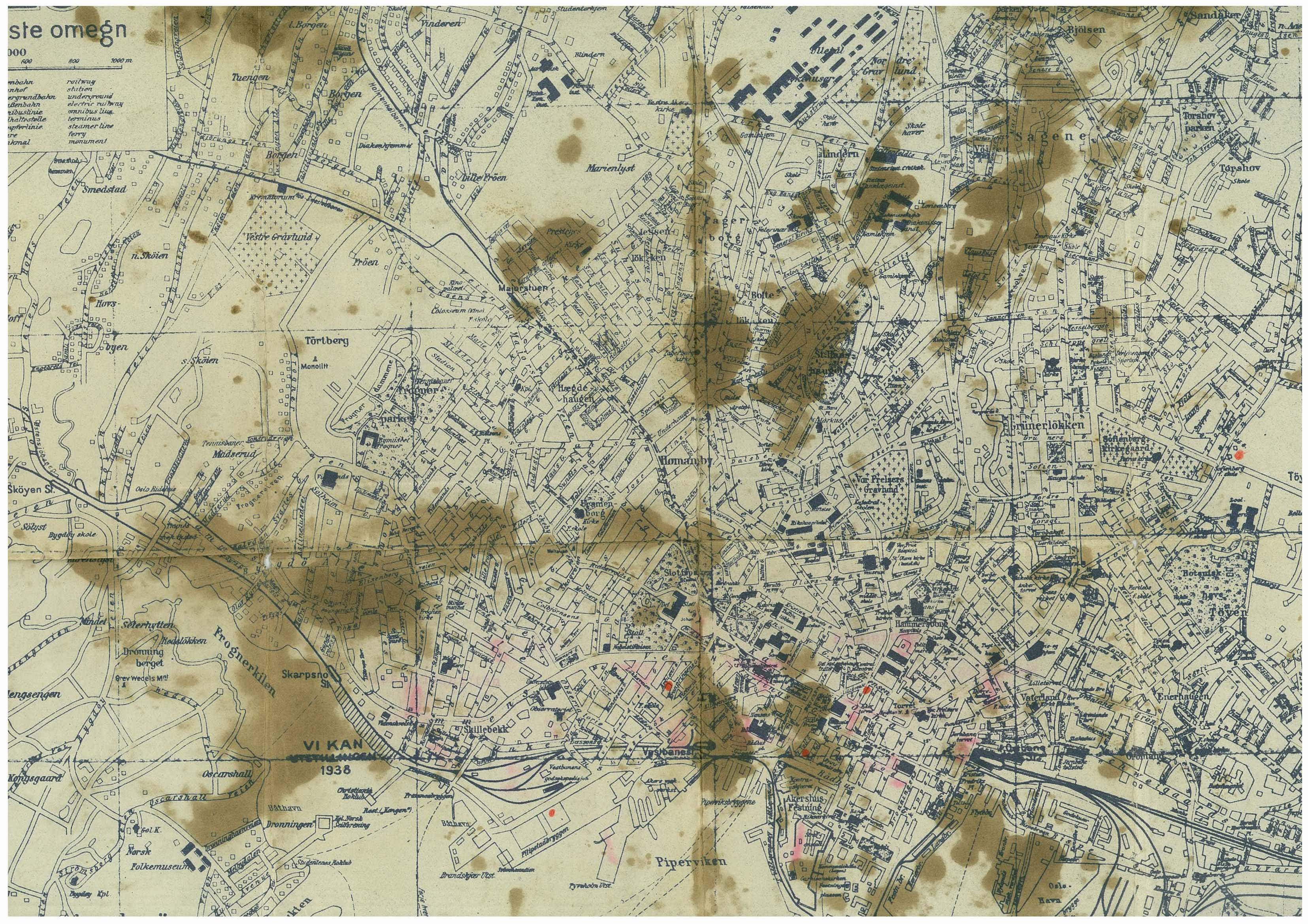 Kartet er påført avmerkninger med rød tusj. Disse punktene er ikke identiske med viktige bygninger som ble beslaglagt av tyskerne under krigen (som bl.a. Handelsstandens hus i Karl Johans gate, Viktoria terrasse i Vika, Oslo Handelsgymnasium i Parkveien, Aker sykehus, Stortinget, Slottet og Akershus festning og regjeringsbygget). Vi har ingen forutsetninger for å kunne si noe om hva som har vært hensikten med avmerkingen. Det vi med stor sikkerhet kan si er at punktene ikke har vært mål for sightseeing under Oslooppholdet.
